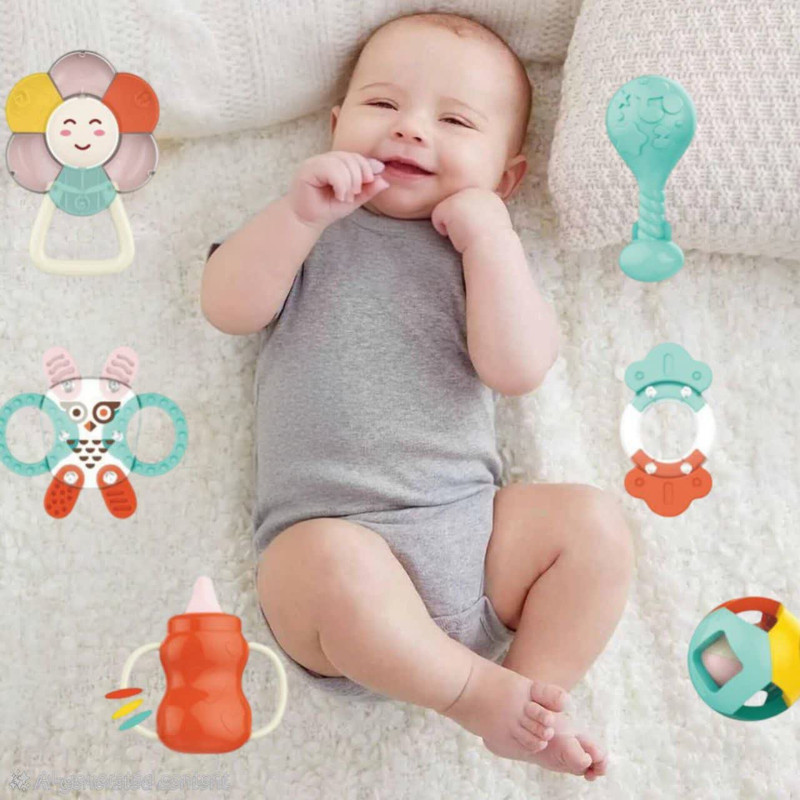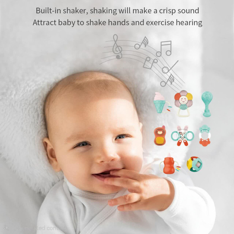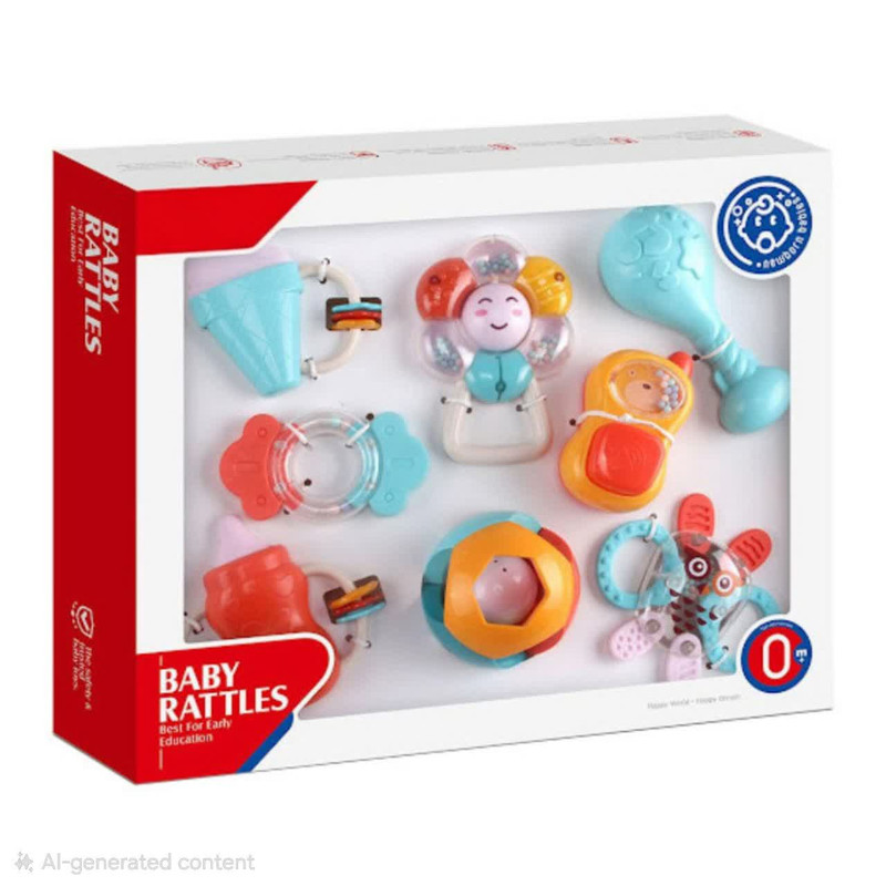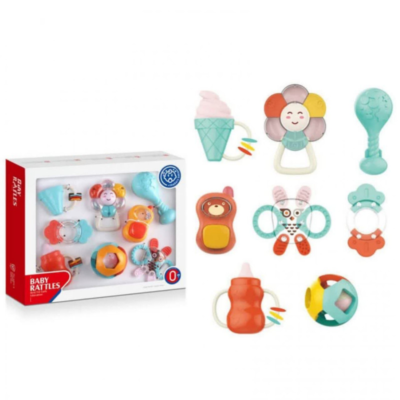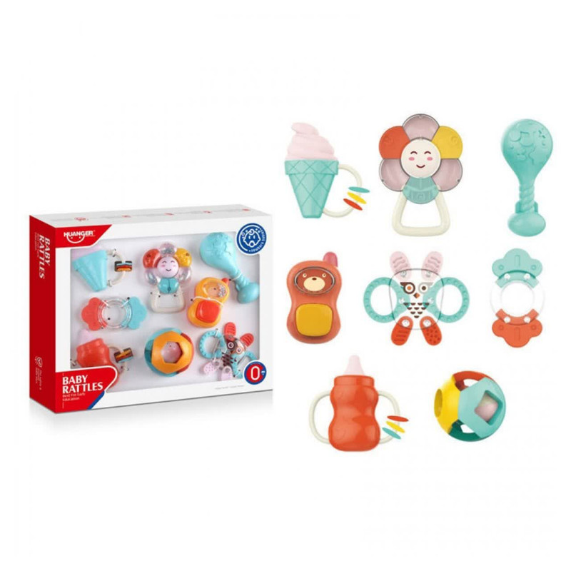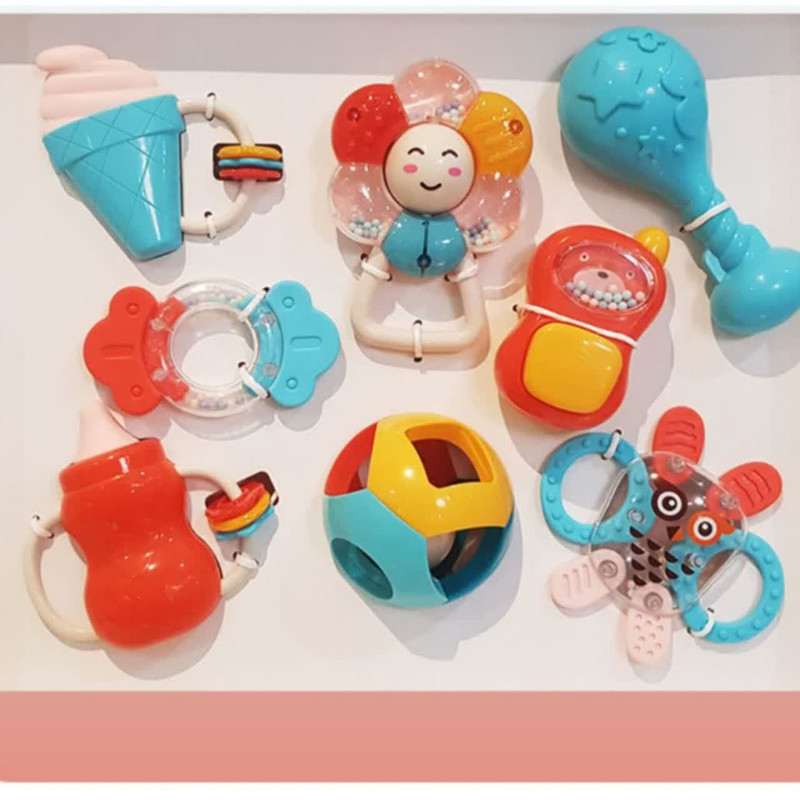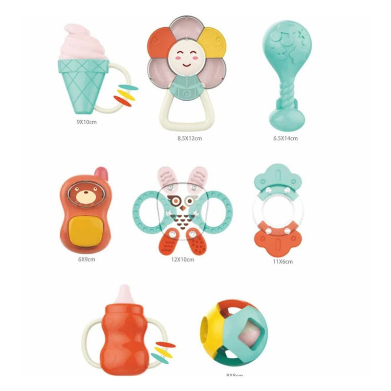 جغجغه ناب سل مدل هانگر مجموعه 8 عددی کد BABY RATTLES HANGER HAPPY WORLD ، ست جغجغه دندانگیر 8 عددی هانگر Huanger دارای 8 جغجغه و دندانگیر در شکلهای مختلفی است. در حلقه این تکهها گویهای کوچکی قرار دارد که نوزاد با تکان دادنشان صدای دلنشینی تولید میکند. این تولید صدا در کنار نرمی و اشکال مختلف و جای دستگیری برای نوزاد جذابیت خاصی دارد. این ست برای کودکان بین 0 تا 18 ماه مناسب است. مناسب برای گروه سنی 0 تا 18 ماه مناسب برای تسکین درد و خارش لثه دارای برجستگی های استاندارد جهت رفع خارش لثه کودک قطعات غیر قابل جداشدن برای ایمنی بیشتر دارای رنگبندی شاد و کودکانه تهیه شده از جنس سیلیکون با کیفیت فاقد هرگونه مواد مضر و شیمیایی قابلیت خنک کردن در یخچال و فریزر سبک و قابل حمل برای نوزاد بسیار با دوام میباشد.