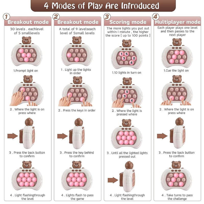 متریال آن از پلاستیک با کیفیت بالا ساخته شده که در طولانی مدت خراب نمی شود . دارای 3 دکمه است که یکی برای روشن/خاموش ، یکی برای کنترل صدا و دیگری برای انتخاب حالت های مختلف بازی می باشد . برای روشن کردن آن به 3 عدد باتری نیم قلمی نیاز دارید .