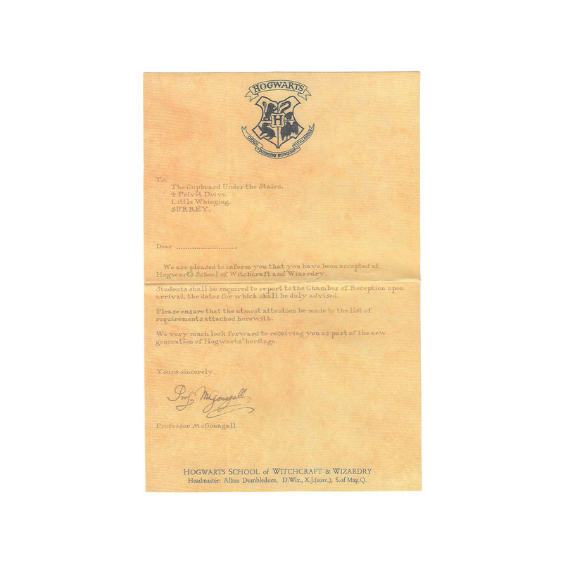 "We are pleased to inform you that you have been accepted at Hogwarts School of Witchcraft and Wizardry."