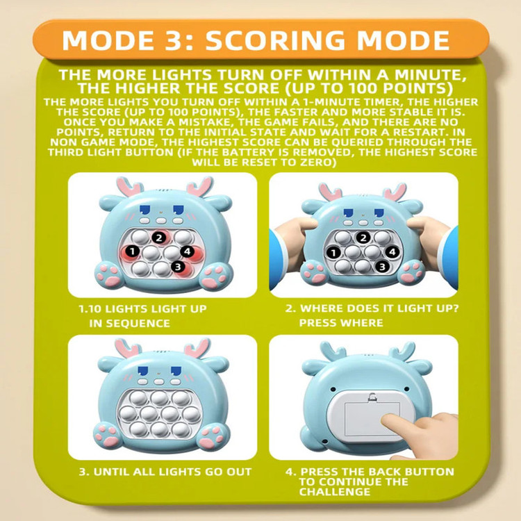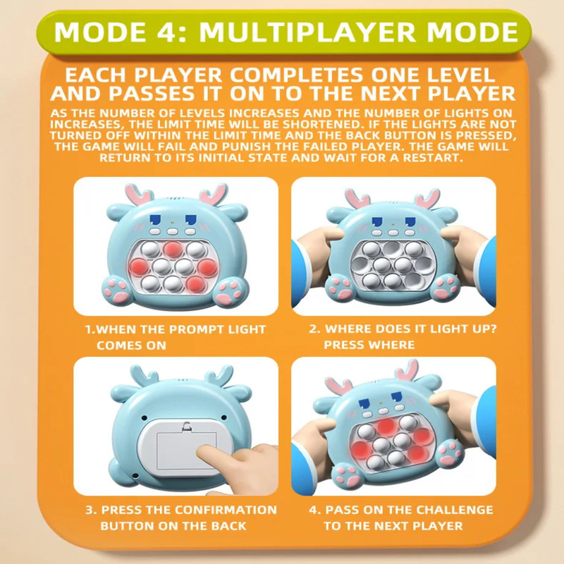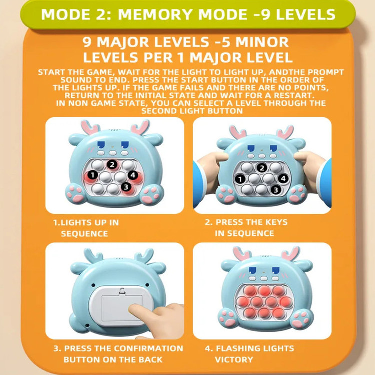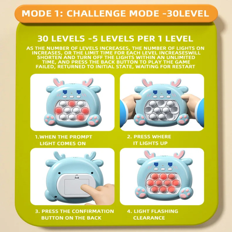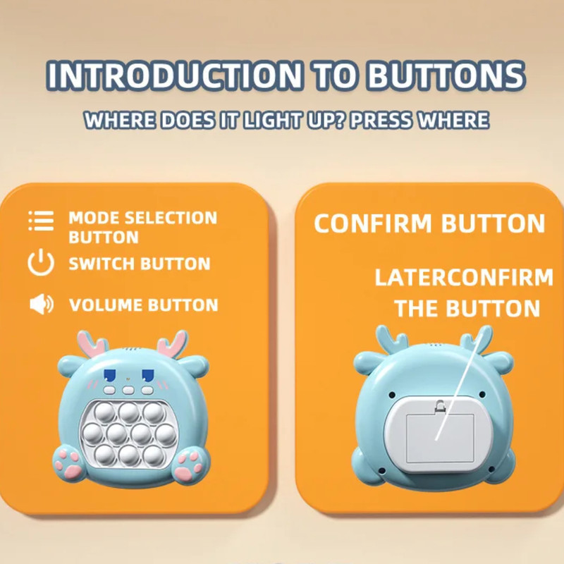 متریال آن از پلاستیک با کیفیت بالا ساخته شده که در طولانی مدت خراب نمی شود . دارای ۳ دکمه است که یکی برای روشن/خاموش ، یکی برای کنترل صدا و دیگری برای انتخاب حالت های مختلف بازی می باشد . برای روشن کردن آن به ۳ عدد باتری نیم قلمی نیاز دارید .