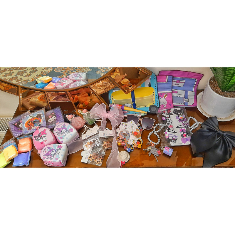 محتویات شانسی شامل موارد زیر است: کش مو فانتزی، گیره مو دانتل، دفترچه یادداشت فانتزی، تل، عروسک مکرومه، جاکلیدی، مداد و خودکار فانتزی، کیف پول جذاب دخترانه، خمیر کلی، هایلایتر، دستبند، ساعت، برچسب، پاک کن و تراش فانتزی،...