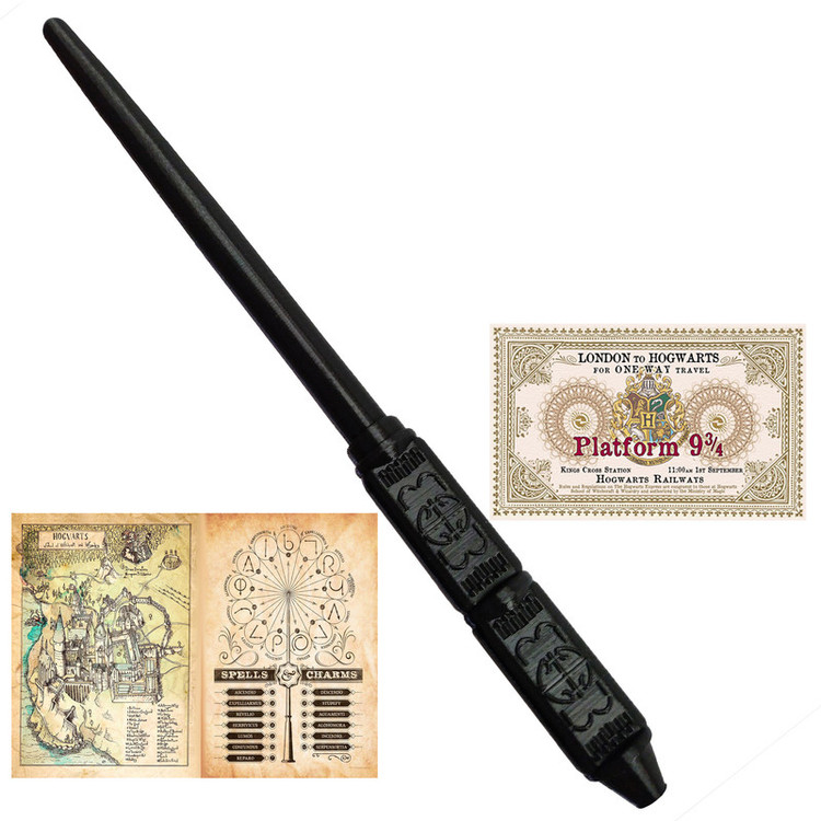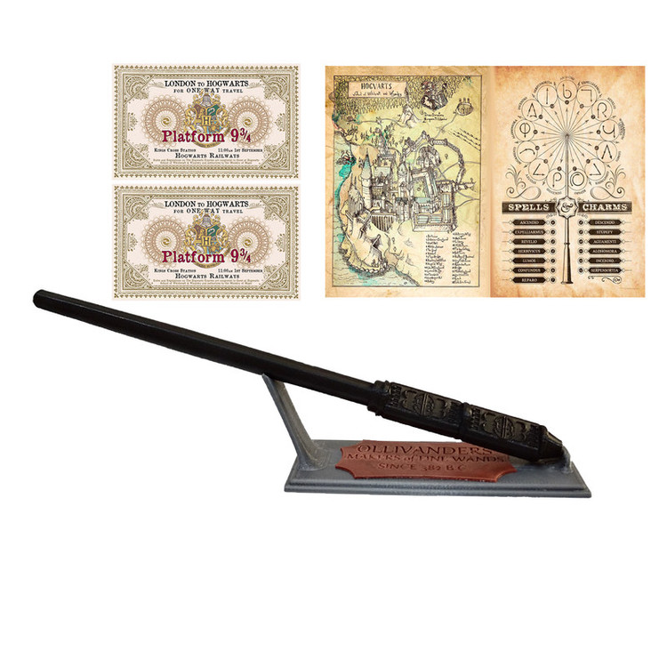چوبدستی شخصیت سوروس اسنیپ از سری فیلم های هری پاتر به همراه با استند و نقشه مدرسه - لیست جادو ها - دو عدد بلیط قطار