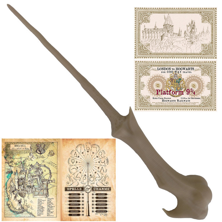 چوبدستی شخصیت لرد ولدمورت از سری فیلم های هری پاتر به همراه با استند و نقشه مدرسه - لیست جادو ها - دو عدد بلیط قطار