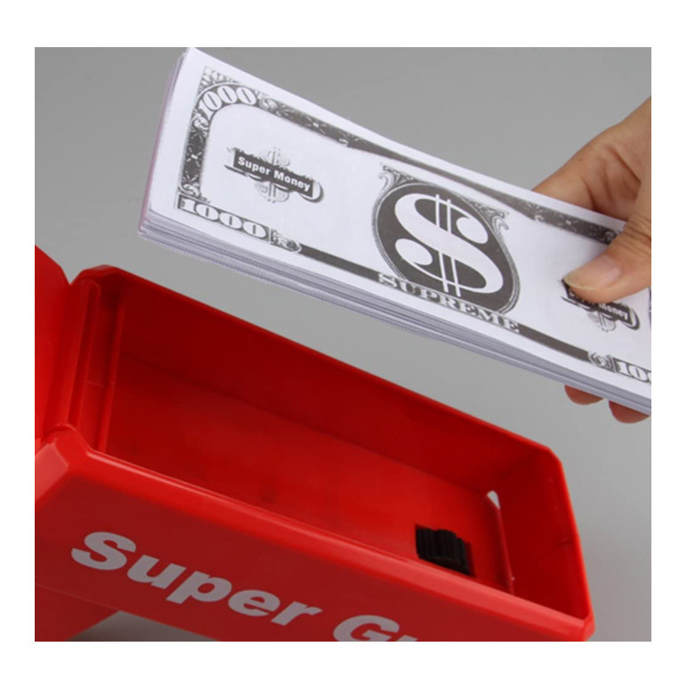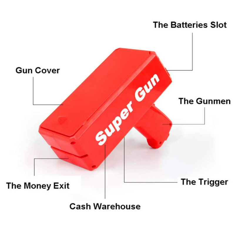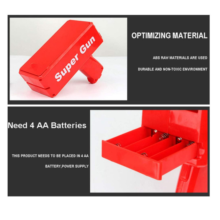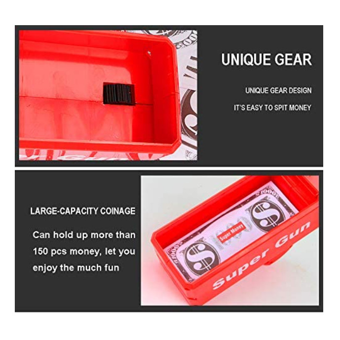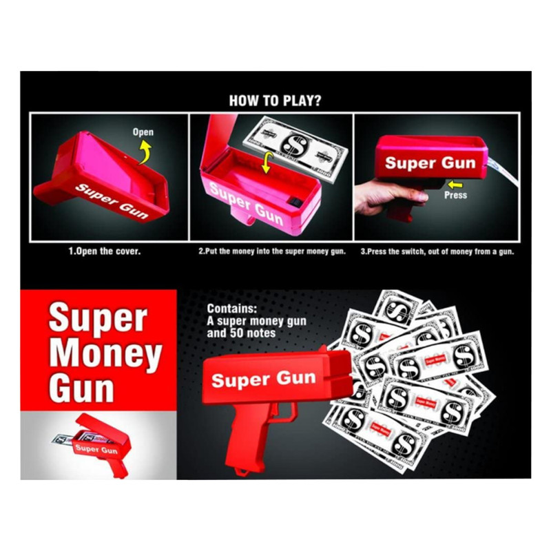 محتویات بسته: 1 عدد تفنگ پول پاش، 100 عدد پول کاغذی تقلبی توجه: این تفنگ پول پاش با استفاده از 4 باتری AA برای کنترل موتور چرخشی کار می کند که این باتری ها همراه تفنگ عرضه نمی شوند، جداگانه تهیه شود.