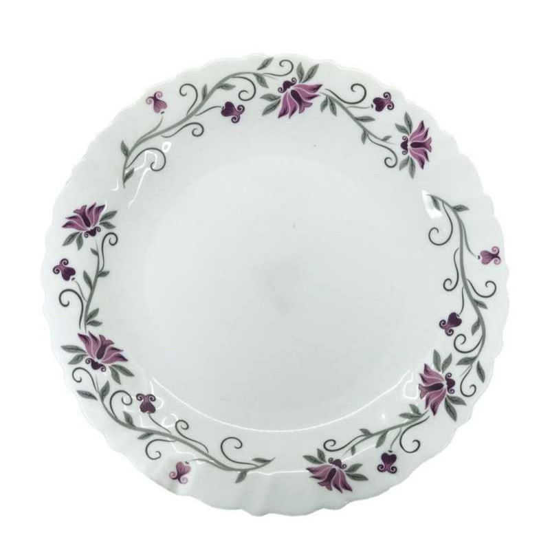 سرویس پلو خوری 6 پارچه پارس اپال مدل لیندا با طرحی از گلهای صورتی و بنفش با شاخه های خاکستری دور تا دور ظرف را پوشانده است.