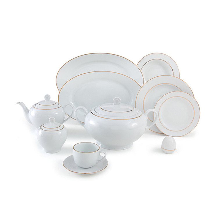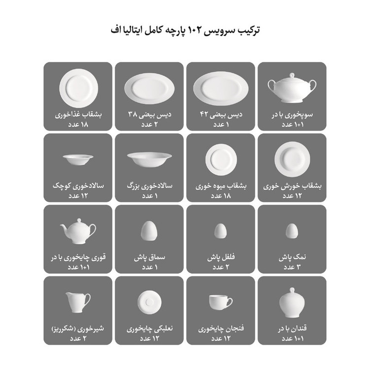 اقلام سرویس: سوپخوری , ظرف سالاد , سالادخوری , دیس , بشقاب غذاخوری , بشقاب خورشخوری , پیشدستی , قوری چایخوری , فنجان , نعلبکی , قندان , شکرریز , نمکپاش و فلفلپاش , ادویهپاش