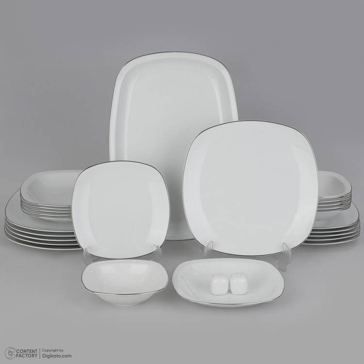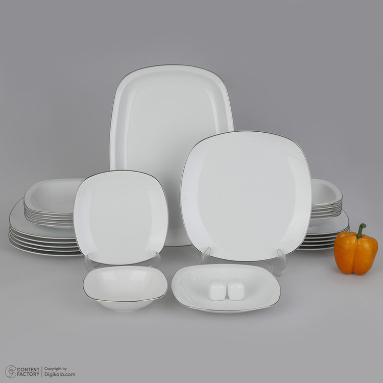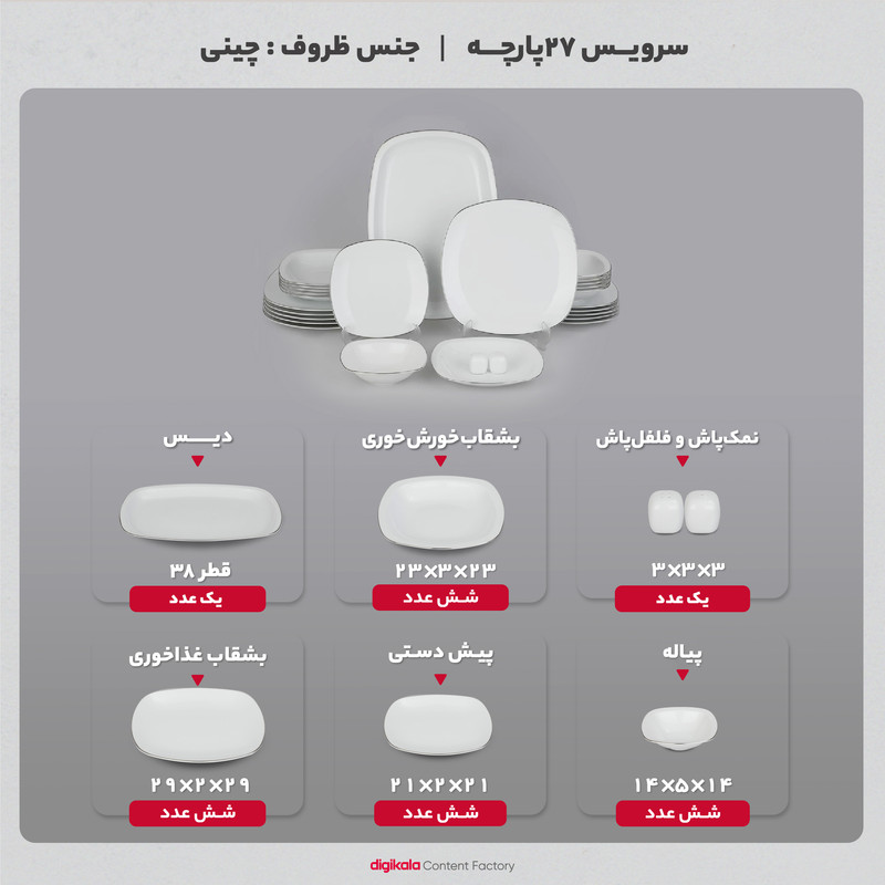 اقلام سرویس: دیس , بشقاب غذاخوری , بشقاب خورشخوری , پیشدستی , نمکپاش و فلفلپاش , پیاله