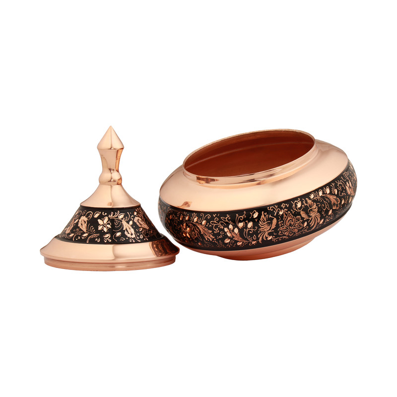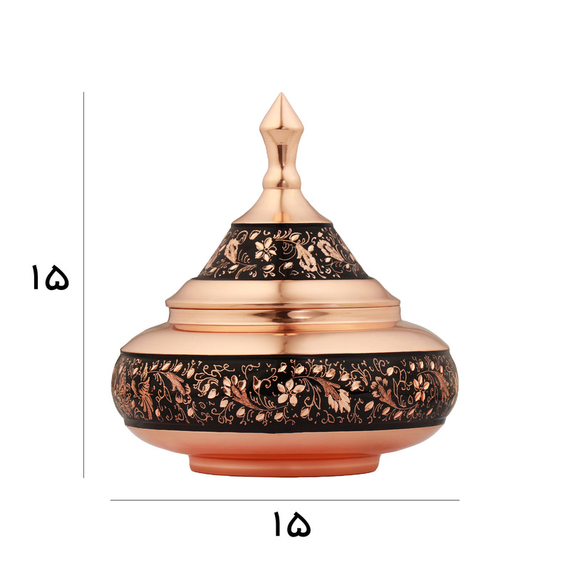 مشخصات فیزیکی: این قندان با ارتفاع 15 سانتیمتر و قطر دهانه 15 سانتیمتر از جنس مس ساخته شده و با هنر اصیل الماستراش اصفهان مزین گردیده است. نقوش ظریف و درخشان حک شده روی بدنه به وسیله قلم های تیغ الماس، نمایی چشمگیر از هنر قلمزنی ایرانی را به نمایش میگذارد. تضاد رنگ مس براق با زمینهی تیره که جلوه ای از قدرت و ثروت دارند و همچنین خطوط درخشان، آن را به انتخابی خاص برای دکوراسیون و هدیه تبدیل کرده است. اندازهی مناسب این اثر باعث میشود بهراحتی در ویترین، میز پذیرایی یا دکور منزل جای گیرد.