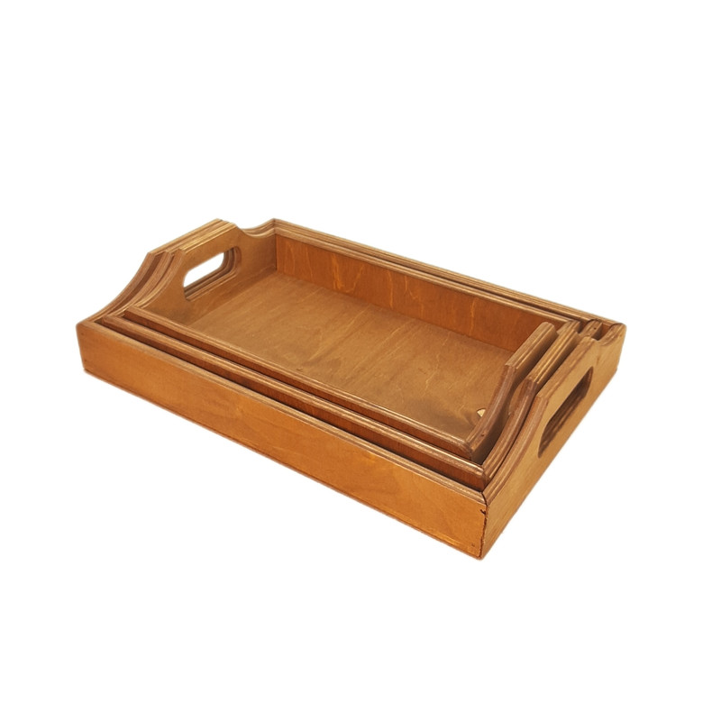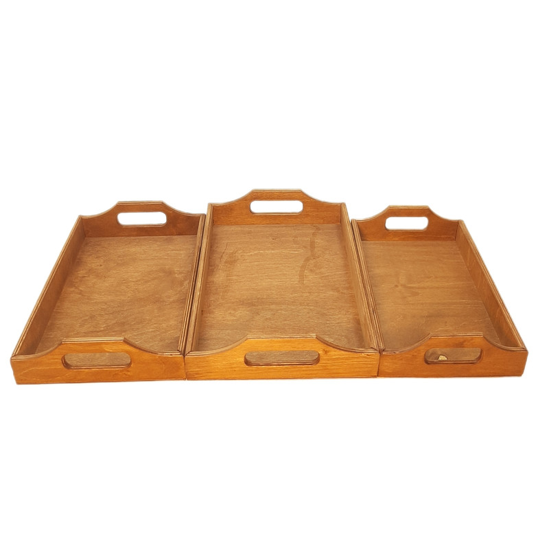 این ست سینی تشکیل شده از 3 سایز بزرگ 34x24 متوسط 32x22 و سایز کوچک 30x20 که ساخته شده از نوع بهترین پلی وود وارداتی که کاملا ضد آب است تشکیل شده ارتفاع این محصول 7 سانت میی باشد