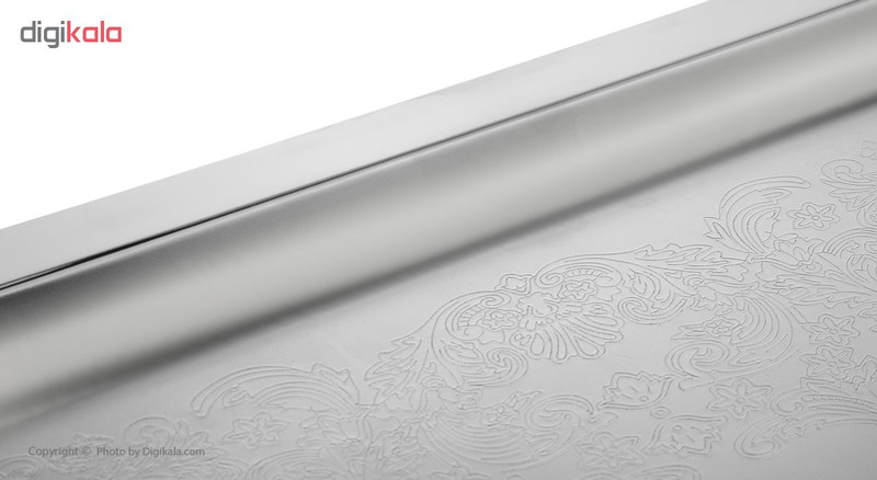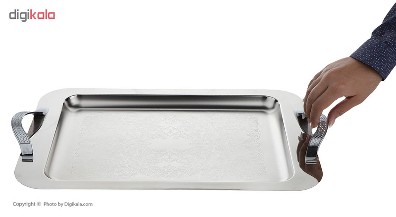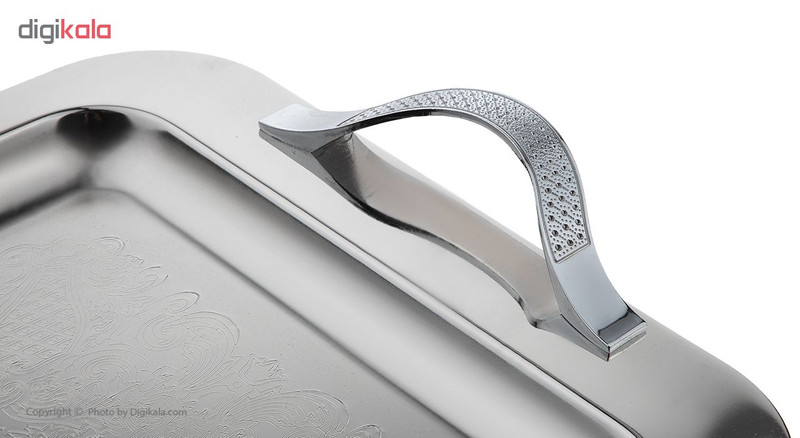 سینی مستطیل کد PM110B-227N L یک انتخاب مناسب برای پذیرایی در منزل شما است. این سینی مستطیل شکل, با سطحی نسبتا گود, یک نمونه جدید وزیبا از جنس استیل مقاوم و ضد زنگ تولید شده و از کیفیت ساخت مناسبی برخوردار است. طرح های حکاکی شده بر روی این محصول علاوه بر ایجاد جلوه ای زیبا، مانع لغزش ظروف سرو دورن آن در هنگام پذیرایی میشود. استفاده از دستمال مرطوب مناسب جهت تمیز کردن مایعات ریخته شده و لکه های ایجاد شده بر روی سطح آن، پیشنهاد میشود. البته می توانید سینی را کاملا شستشو دهید زیرا جنس آن استیل است. یکی از نکات مثبت در طراحی این سینی دستههای ساده و شکیل آن است, در دو طرف آن دو دسته وجود دارد که توسط پیچ به سینی متصل شدهاند. فرم دستهها به شکل یک منحنی شیبدار است که به سینی متصل شده است و دارای طرح هایی نگین گونه است که جلوه چشمگیری به سینی داده است. همچنین ضخامت مناسبی دارد تا در اثر ضربه کمترین آسیب را ببیند. ابعاد مناسب و کوچک آن برای پذیرایی در میهمانی های خودمونی و مصرف روزانه نیز بسیار کاربردی است.دستگیره آن از مواد سربی به روش دایکست میباشد که مقاومت بالایی دارد و دارای روکش فلزی, نیکل کروم است و از اکسیداسیون جلوگیری میکند که هیچ گونه لکه ای بر روی دسته ها باقی نماند واثر آن به راحتی پاک می شود