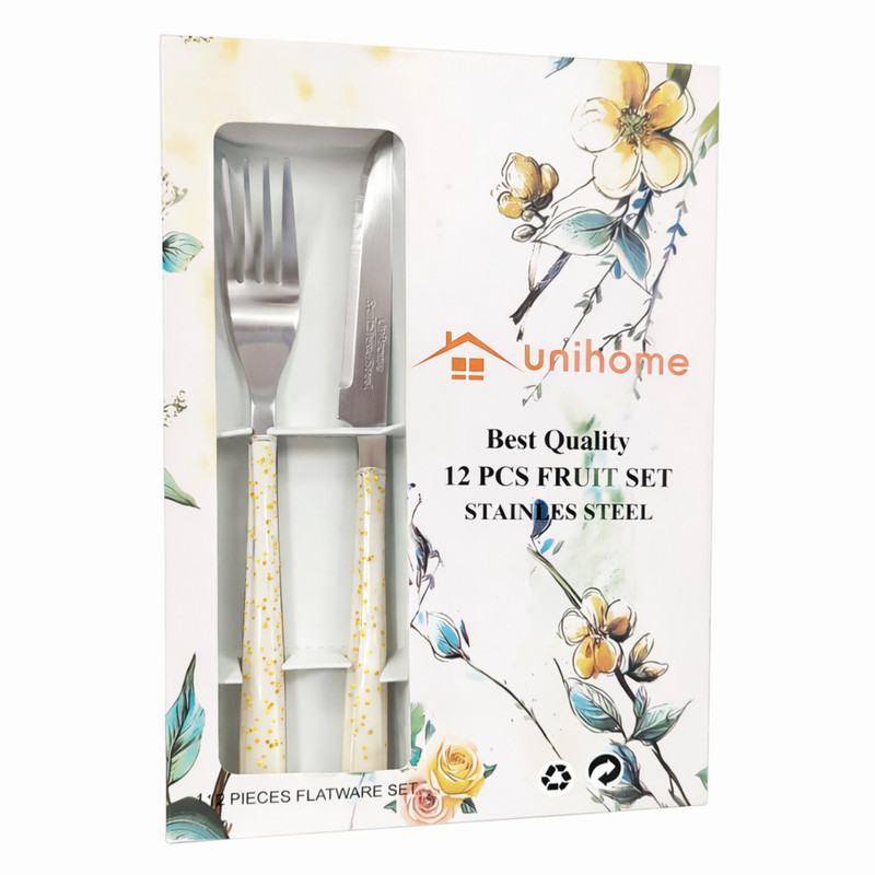 کارد و چنگال 12 پارچه یونی هوم طرح نگینی دارای 6 عدد کارد و 6 عدد چنگال میباشد. این سرویس 12 پارچه دارای بدنه ای با جنس استیل و دسته آن از جنس پلاستیک فشرده نشکن میباشد. این محصول از نوع بهترین جنس بازار میباشد. با قابلیت شست و شو مدام با ماشین ظرف شویی و دست.