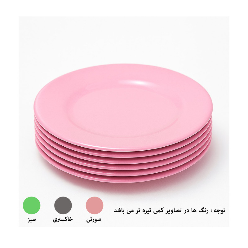 بشقاب میوه خوری ملامین مینای یزد مجموعه 6 عددی ، ابعاد : 19.5 در 19.5 در 1.5 سانتیمتر ، وزن هر عدد 140 گرم ، رنگ کالا نسبت به تصاویر روشن تر بوده و حدود 20 درصد اختلاف رنگ کالا با تصاویر به دلیل شرایط نوری بدیهی است.