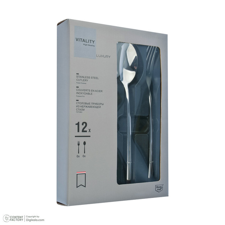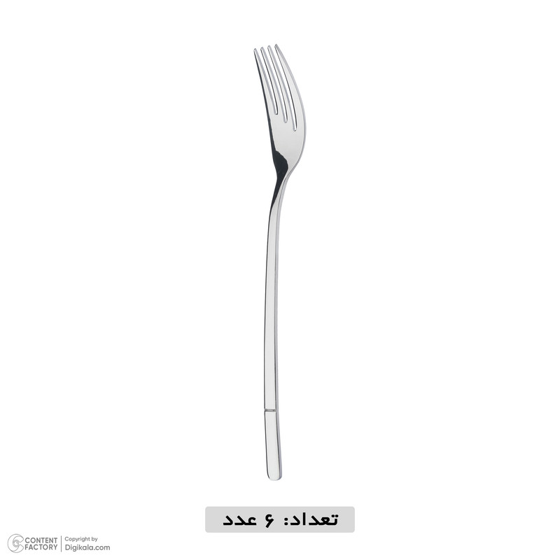6 عدد قاشق به ابعاد 22x4x0.3 سانتی متر و وزن 55 گرم - 6 عدد چنگال به ابعاد 22x2x0.3 سانتی متر و وزن 45 گرم - استیل18/10ضد زنگ با ضخامت 3 میلیمتر