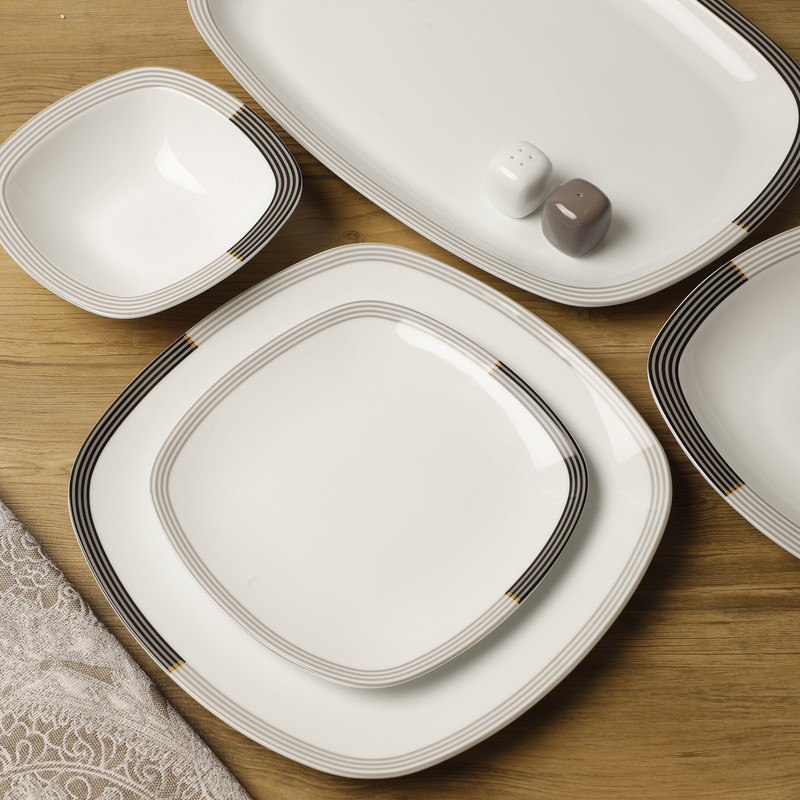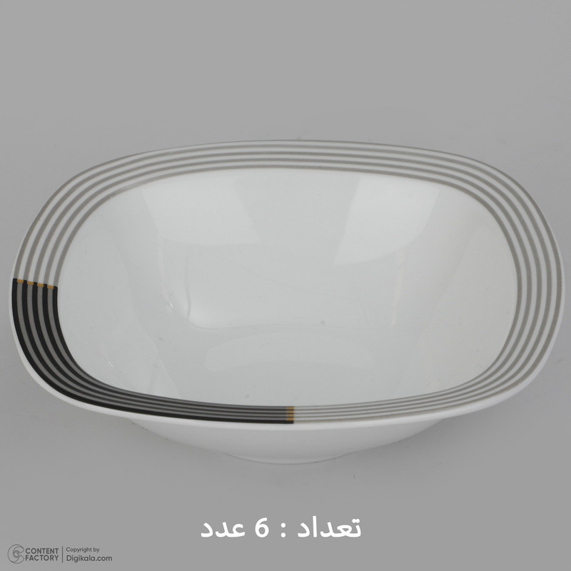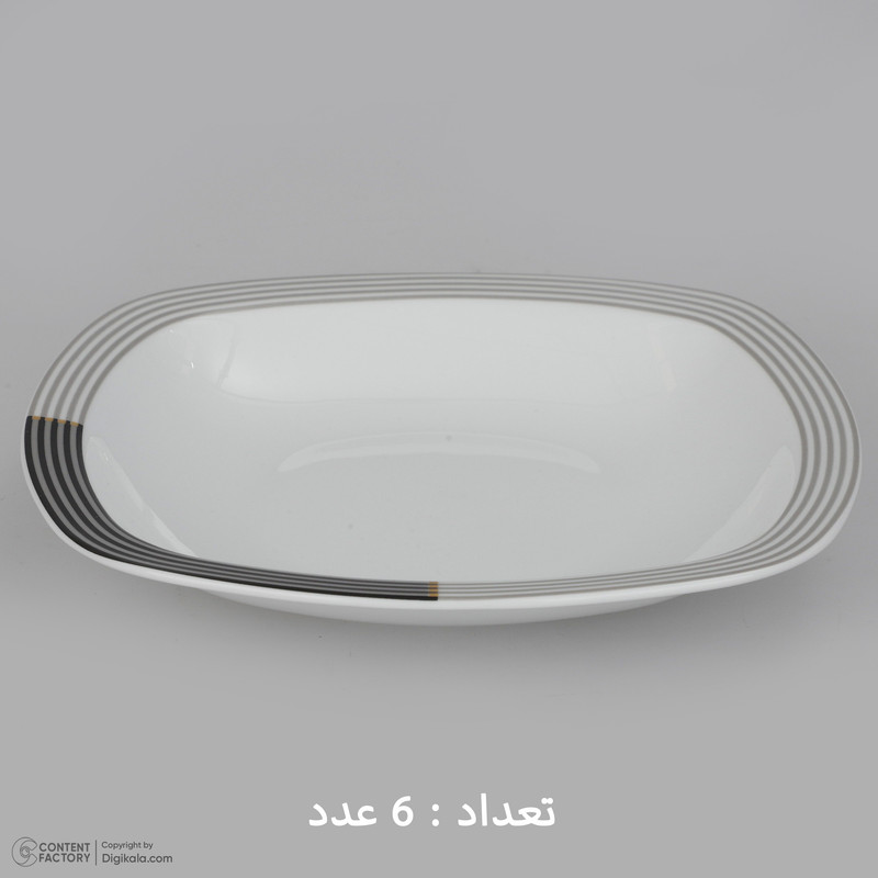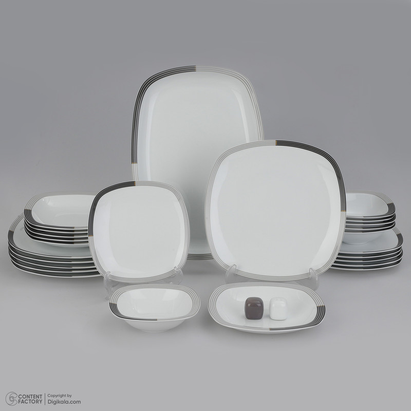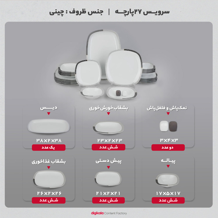 اقلام سرویس: دیس , بشقاب غذاخوری , بشقاب خورشخوری , پیشدستی , نمکپاش و فلفلپاش , پیاله